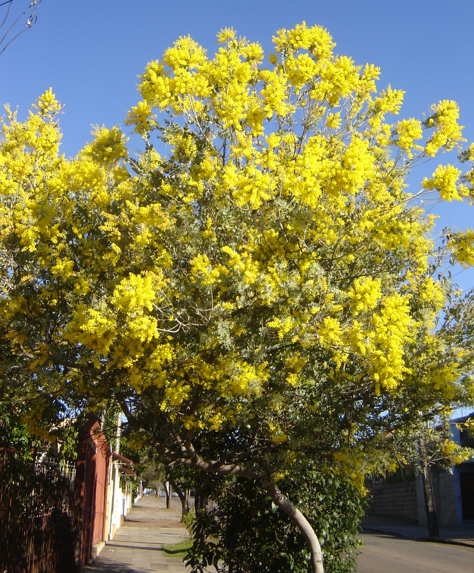 Acacia-mimosa (Acacia podalalyriiifolia), de flores amarelas e folhas verdes acinzentadas, de 6,0 metros de altura e floração no inverno.